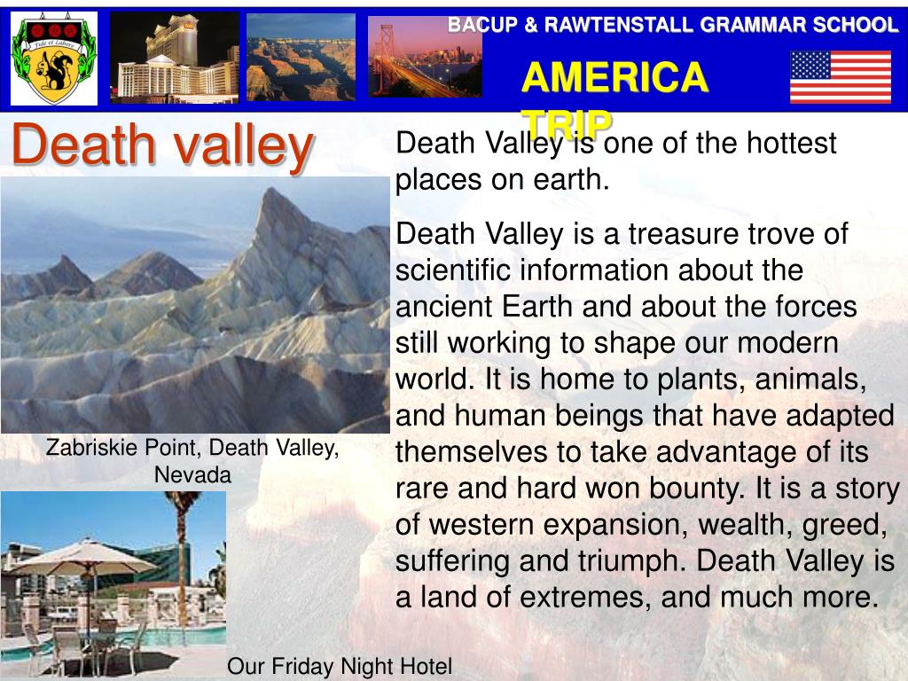 Zabriskie Point, Death Valley, Nevada Our Friday Night Hotel Death valley Death Valley is one of the hottest places on earth. Death Valley is a treasure trove of scientific information about the ancient Earth and about the forces still working to shape our modern world. It is home to plants, animals, and human beings that have adapted themselves to take advantage of its rare and hard won bounty. It is a story of western expansion, wealth, greed, suffering and triumph. Death Valley is a land of extremes, and much more.
