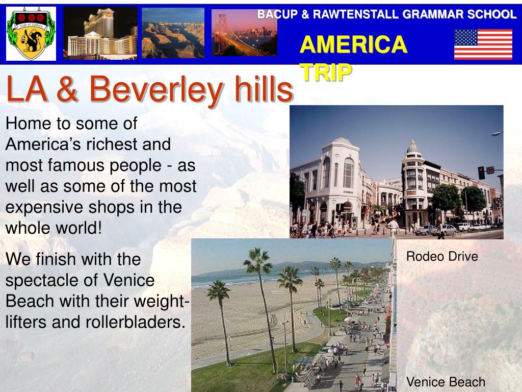 Rodeo Drive Venice Beach LA & Beverley hills Home to some of America’s richest and most famous people - as well as some of the most expensive shops in the whole world! We finish with the spectacle of Venice Beach with their weight-lifters and rollerbladers.