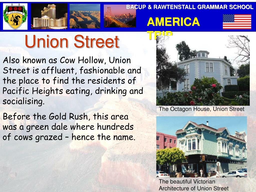 The Octagon House, Union Street The beautiful Victorian Architecture of Union Street Union Street Also known as Cow Hollow, Union Street is affluent, fashionable and the place to find the residents of Pacific Heights eating, drinking and socialising. Before the Gold Rush, this area was a green dale where hundreds of cows grazed – hence the name.