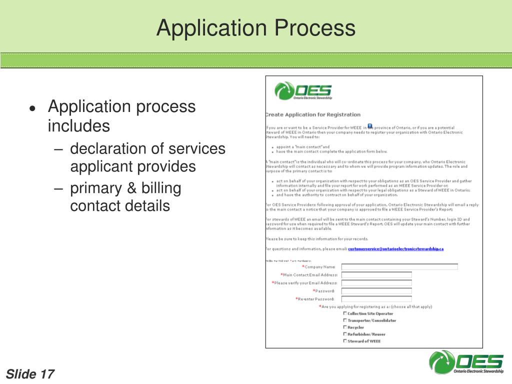 Registration Requirements • Single access to online system • https://mtsreg.oesdatasystem.ca/login.aspx • Registration required for: • primary EOL WEEE recyclers • reuse/refurbishers under program • transportation & consolidation operators • collection site operators & sites • stewards of WEEE