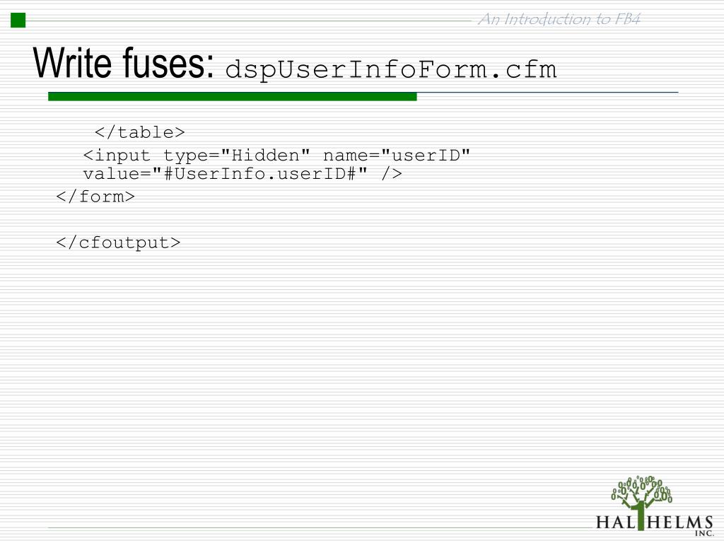 Write fuses: dspUserInfoForm.cfm </table> <input type="Hidden" name="userID" value="#UserInfo.userID#" /> </form> </cfoutput>