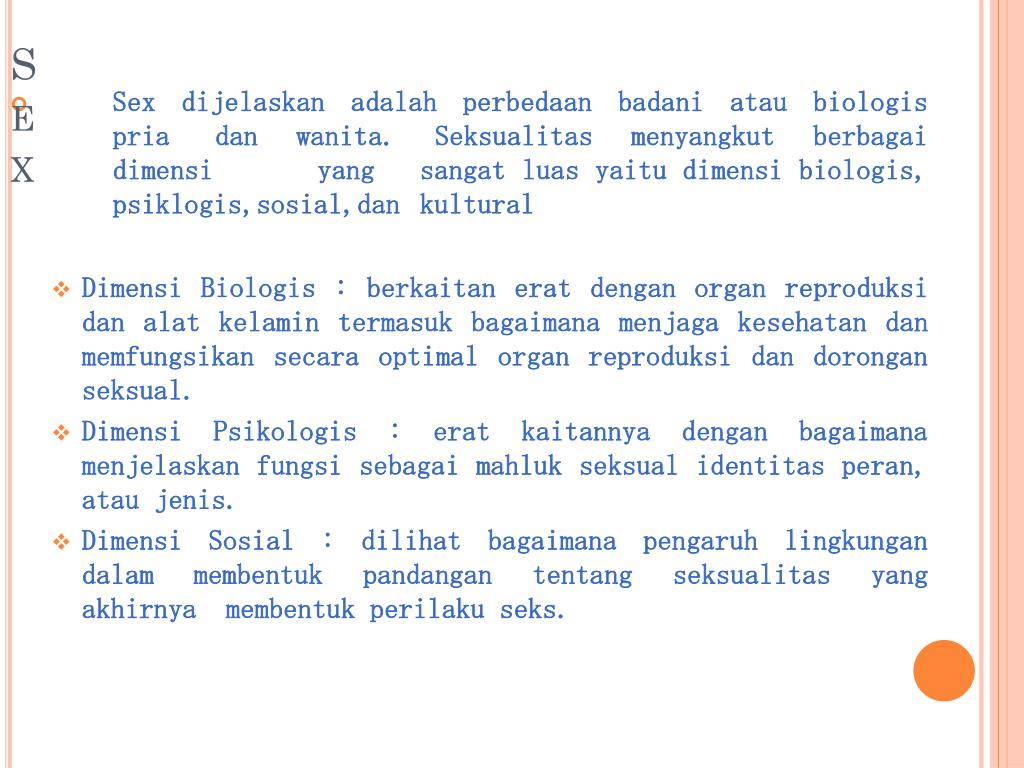 Sex dijelaskanadalahperbedaanbadaniataubiologispriadanwanita. Seksualitasmenyangkutberbagaidimensi yang sangatluasyaitudimensibiologis, psiklogis,sosial,dankultural DimensiBiologis : berkaitaneratdengan organ reproduksidanalatkelamintermasukbagaimanamenjagakesehatandanmemfungsikansecara optimal organ reproduksidandoronganseksual. DimensiPsikologis : eratkaitannyadenganbagaimanamenjelaskanfungsisebagaimahlukseksualidentitasperan, ataujenis. DimensiSosial : dilihatbagaimanapengaruhlingkungandalammembentukpandangantentangseksualitas yang akhirnyamembentukperilakuseks. Sex