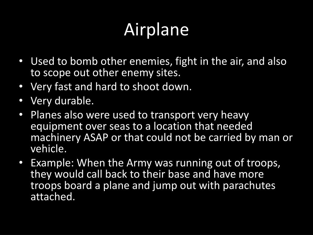Airplane • Used to bomb other enemies, fight in the air, and also to scope out other enemy sites. • Very fast and hard to shoot down. • Very durable. • Planes also were used to transport very heavy equipment over seas to a location that needed machinery ASAP or that could not be carried by man or vehicle. • Example: When the Army was running out of troops, they would call back to their base and have more troops board a plane and jump out with parachutes attached.