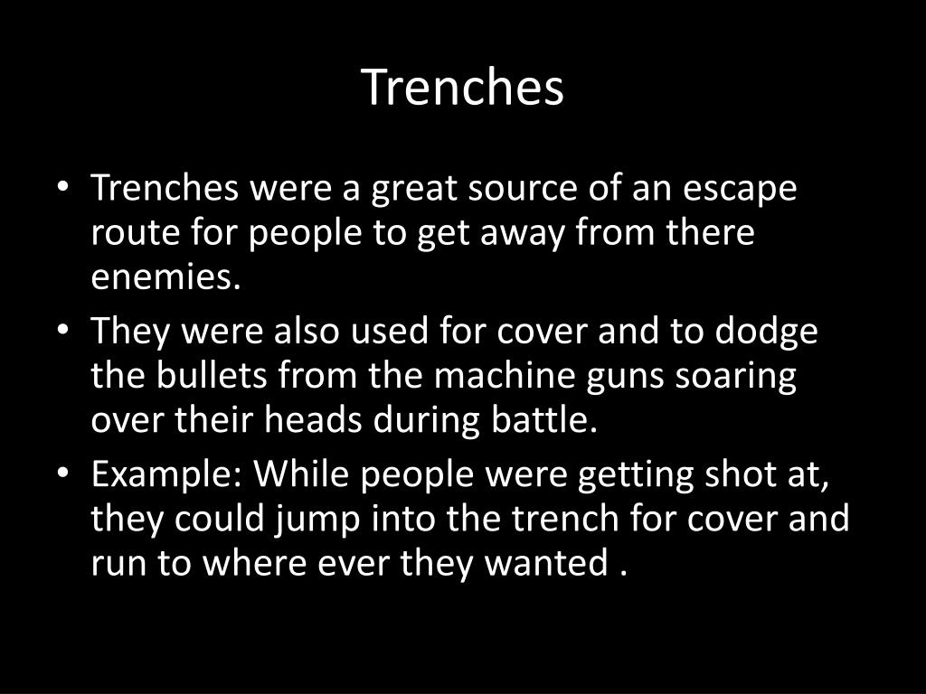 Trenches • Trenches were a great source of an escape route for people to get away from there enemies. • They were also used for cover and to dodge the bullets from the machine guns soaring over their heads during battle. • Example: While people were getting shot at, they could jump into the trench for cover and run to where ever they wanted .
