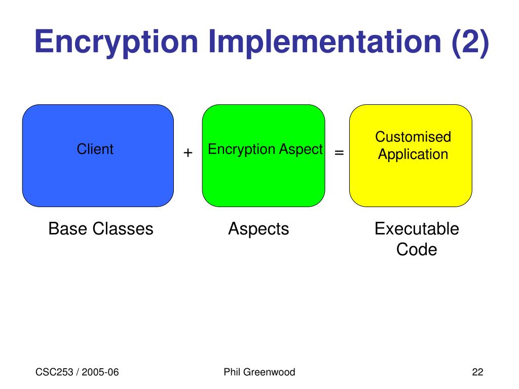Encryption Implementation (2) Customised Application Client + Encryption Aspect = Base Classes Aspects Executable Code Phil Greenwood