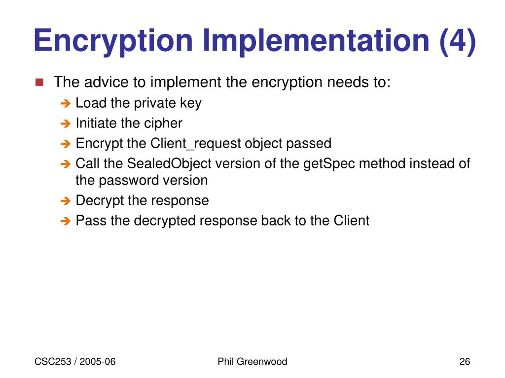 Encryption Implementation (4) • The advice to implement the encryption needs to: • Load the private key • Initiate the cipher • Encrypt the Client_request object passed • Call the SealedObject version of the getSpec method instead of the password version • Decrypt the response • Pass the decrypted response back to the Client Phil Greenwood