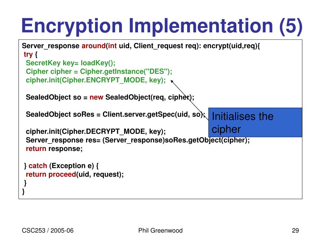 Encryption Implementation (5) Server_response around(int uid, Client_request req): encrypt(uid,req){ try { SecretKey key= loadKey(); Cipher cipher = Cipher.getInstance("DES"); cipher.init(Cipher.ENCRYPT_MODE, key); SealedObject so = new SealedObject(req, cipher); SealedObject soRes = Client.server.getSpec(uid, so); cipher.init(Cipher.DECRYPT_MODE, key); Server_response res= (Server_response)soRes.getObject(cipher); return response; } catch (Exception e) { return proceed(uid, request); } } Initialises the cipher Phil Greenwood