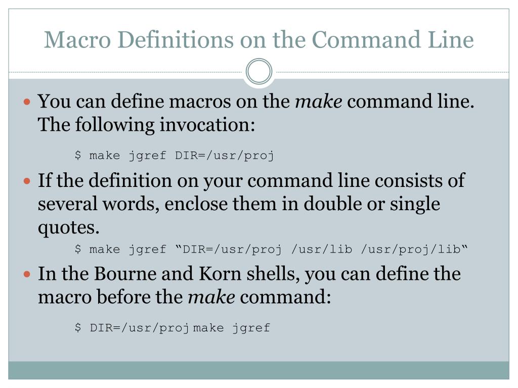 Macro Definitions on the Command Line You can define macros on the make command line. The following invocation: $ make jgref DIR=/usr/proj If the definition on your command line consists of several words, enclose them in double or single quotes. $ make jgref“DIR=/usr/proj /usr/lib /usr/proj/lib“ In the Bourne and Korn shells, you can define the macro before the make command: $ DIR=/usr/projmake jgref