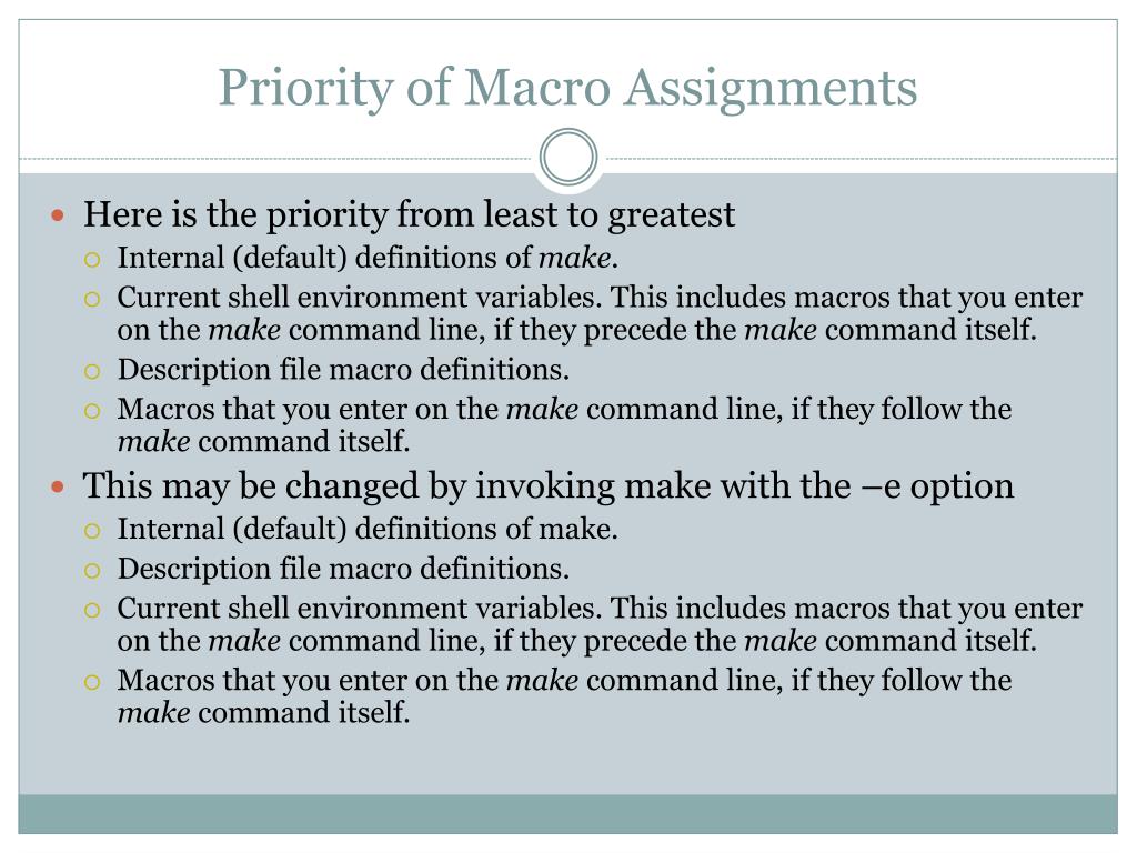 Priority of Macro Assignments • Here is the priority from least to greatest • Internal (default) definitions of make. • Current shell environment variables. This includes macros that you enter on the make command line, if they precede the make command itself. • Description file macro definitions. • Macros that you enter on the make command line, if they follow the make command itself. • This may be changed by invoking make with the –e option • Internal (default) definitions of make. • Description file macro definitions. • Current shell environment variables. This includes macros that you enter on the make command line, if they precede the make command itself. • Macros that you enter on the make command line, if they follow the make command itself.