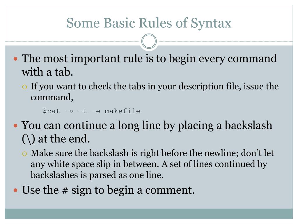 Some Basic Rules of Syntax • The most important rule is to begin every command with a tab. • If you want to check the tabs in your description file, issue the command, $cat –v –t –e makefile • You can continue a long line by placing a backslash (\) at the end. • Make sure the backslash is right before the newline; don’t let any white space slip in between. A set of lines continued by backslashes is parsed as one line. • Use the # sign to begin a comment.