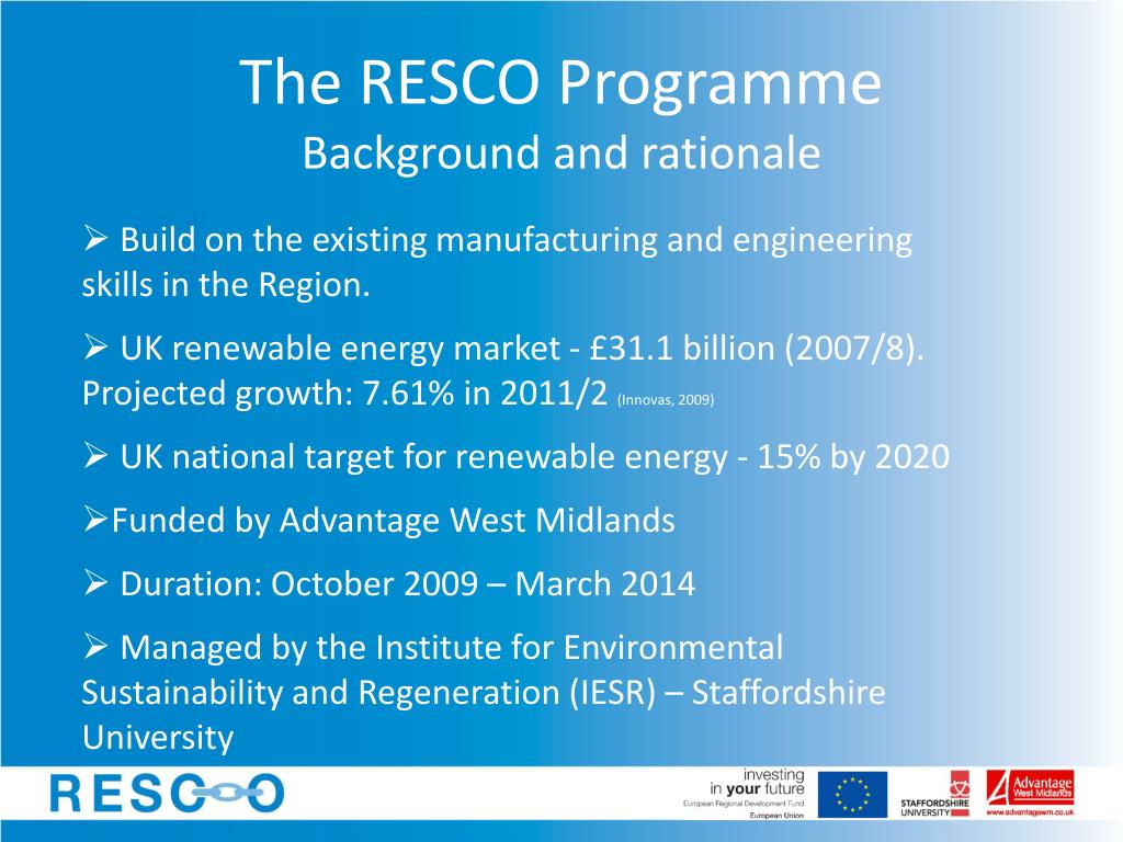 The RESCO Programme Background and rationale • Build on the existing manufacturing and engineering skills in the Region. • UK renewable energy market - £31.1 billion (2007/8). Projected growth: 7.61% in 2011/2 (Innovas, 2009) • UK national target for renewable energy - 15% by 2020 • Funded by Advantage West Midlands • Duration: October 2009 – March 2014 • Managed by the Institute for Environmental Sustainability and Regeneration (IESR) – Staffordshire University