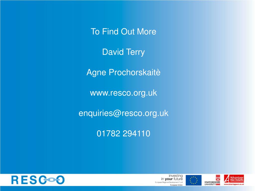 To Find Out More David Terry Agne Prochorskaitè www.resco.org.uk enquiries@resco.org.uk 01782 294110
