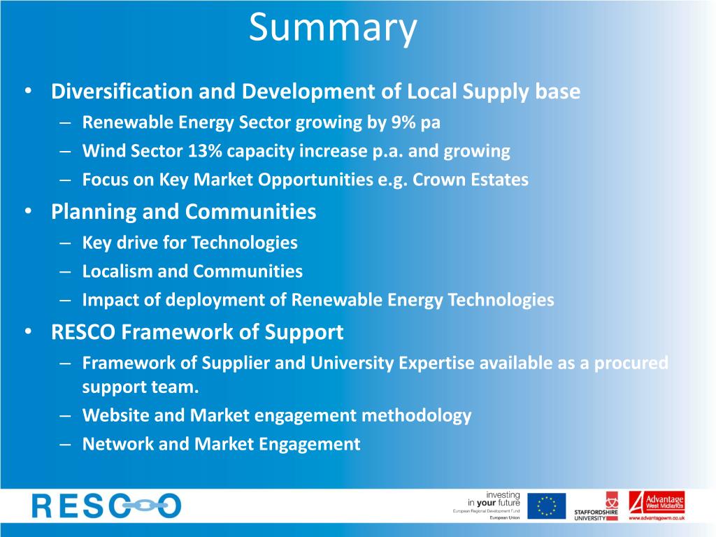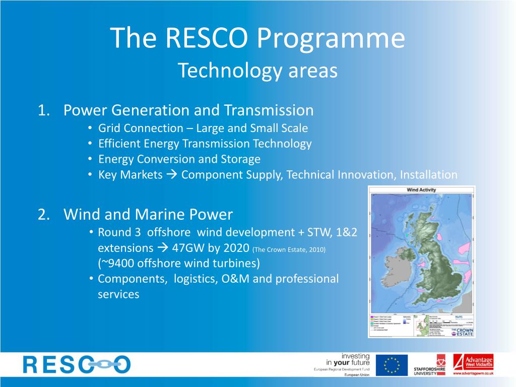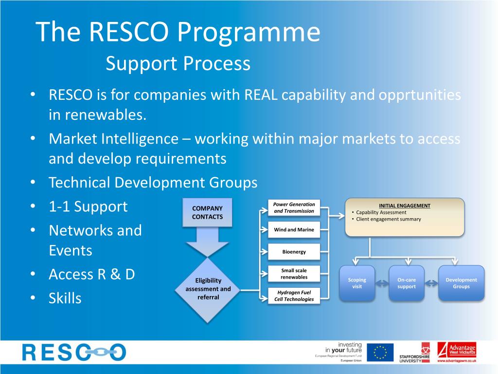 Renewable Energy Supply Chain Opportunities Helping businesses access the commercial opportunities in the supply chain of the new and renewable energy marketplace. Provides a range of support activities focussed on market intelligence, innovation, and diversification. David Terry www.resco.org.uk d.terry@staffs.ac.uk 01782 294110