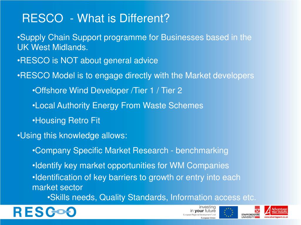 RESCO - What is Different? • Supply Chain Support programme for Businesses based in the UK West Midlands. • RESCO is NOT about general advice • RESCO Model is to engage directly with the Market developers • Offshore Wind Developer /Tier 1 / Tier 2 • Local Authority Energy From Waste Schemes • Housing Retro Fit • Using this knowledge allows: • Company Specific Market Research - benchmarking • Identify key market opportunities for WM Companies • Identification of key barriers to growth or entry into each market sector • Skills needs, Quality Standards, Information access etc.
