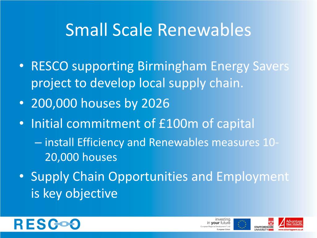 Small Scale Renewables • RESCO supporting Birmingham Energy Savers project to develop local supply chain. • 200,000 houses by 2026 • Initial commitment of £100m of capital • install Efficiency and Renewables measures 10-20,000 houses • Supply Chain Opportunities and Employment is key objective