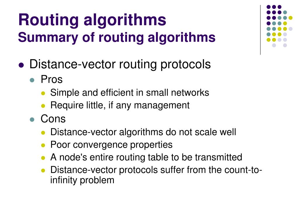 Routing algorithmsSummary of routing algorithms • Distance-vector routing protocols • Pros • Simple and efficient in small networks • Require little, if any management • Cons • Distance-vector algorithms do not scale well • Poor convergence properties • A node's entire routing table to be transmitted • Distance-vector protocols suffer from the count-to-infinity problem