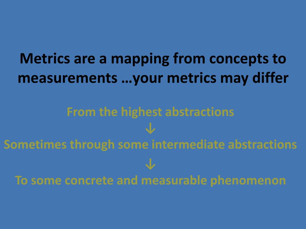 Metrics are a mapping from concepts to measurements …your metrics may differ From the highest abstractions↓Sometimes through some intermediate abstractions ↓ To some concrete and measurable phenomenon