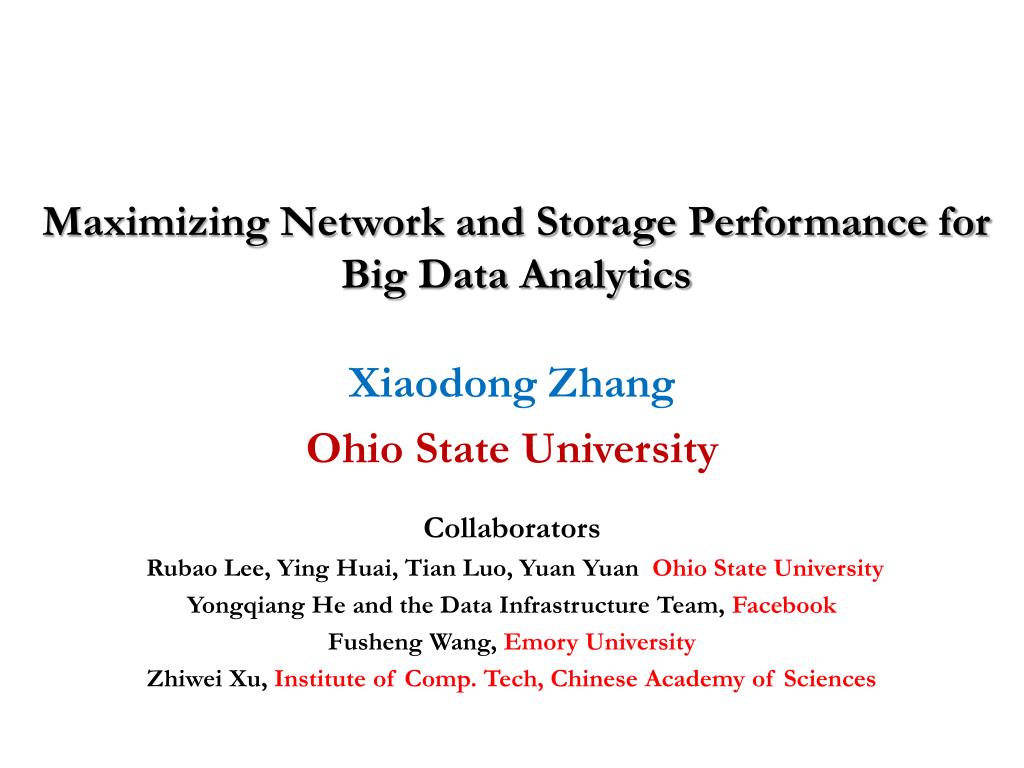 Maximizing Network and Storage Performance for Big Data Analytics. Xiaodong Zhang Ohio State University. Collaborators Rubao Lee, Ying Huai, Tian Luo, Yuan Yuan Ohio State University Yongqiang He and the Data Infrastructure Team, Facebook Fusheng Wang, Emory University