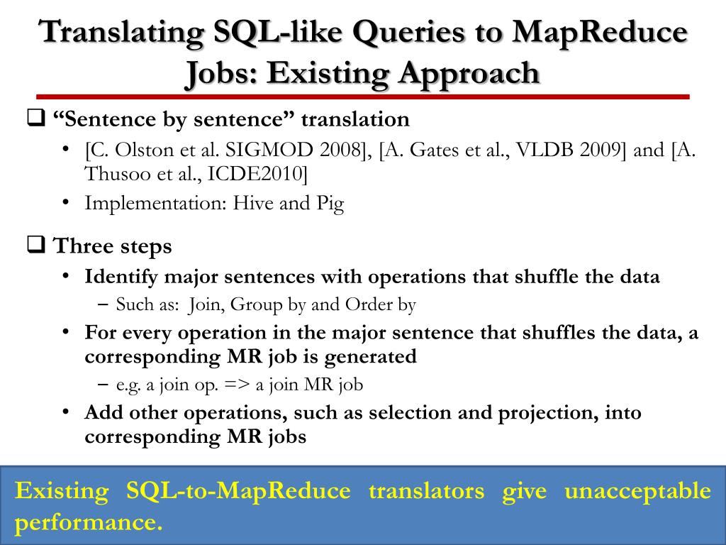 Translating SQL-like Queries to MapReduce Jobs: Existing Approach • “Sentence by sentence” translation • [C. Olston et al. SIGMOD 2008], [A. Gates et al., VLDB 2009] and [A. Thusoo et al., ICDE2010] • Implementation: Hive and Pig • Three steps • Identify major sentences with operations that shuffle the data • Such as: Join, Group by and Order by • For every operation in the major sentence that shuffles the data, a corresponding MR job is generated • e.g. a join op. => a join MR job • Add other operations, such as selection and projection, into corresponding MR jobs Existing SQL-to-MapReduce translators give unacceptable performance.