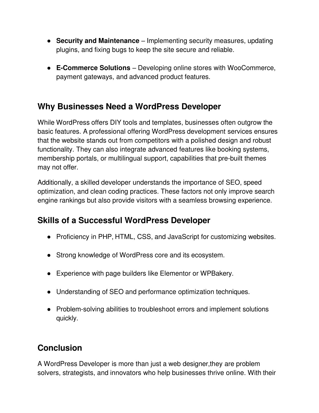 SecurityandMaintenance–Implementingsecuritymeasures,updating plugins,andfixingbugstokeepthesitesecureandreliable. • E-CommerceSolutions–DevelopingonlinestoreswithWooCommerce, paymentgateways,andadvancedproductfeatures. • WhyBusinessesNeedaWordPressDeveloper • WhileWordPressoffersDIYtoolsandtemplates,businessesoftenoutgrowthe basicfeatures.AprofessionalofferingWordPressdevelopmentservicesensures thatthewebsitestandsoutfromcompetitorswithapolisheddesignandrobust functionality.Theycanalsointegrateadvancedfeatureslikebookingsystems, membershipportals,ormultilingualsupport,capabilitiesthatpre-builtthemes maynotoffer. • Additionally,askilleddeveloperunderstandstheimportanceofSEO,speed optimization,andcleancodingpractices.Thesefactorsnotonlyimprovesearch enginerankingsbutalsoprovidevisitorswithaseamlessbrowsingexperience. • SkillsofaSuccessfulWordPressDeveloper • Proficiencyin PHP,HTML,CSS,andJavaScriptforcustomizingwebsites. • StrongknowledgeofWordPresscoreanditsecosystem. • ExperiencewithpagebuilderslikeElementororWPBakery. • UnderstandingofSEOandperformanceoptimizationtechniques. • Problem-solvingabilitiestotroubleshooterrorsandimplementsolutions quickly. • Conclusion • AWordPressDeveloperismorethanjustawebdesigner,theyareproblem solvers,strategists,andinnovatorswhohelpbusinessesthriveonline.Withtheir