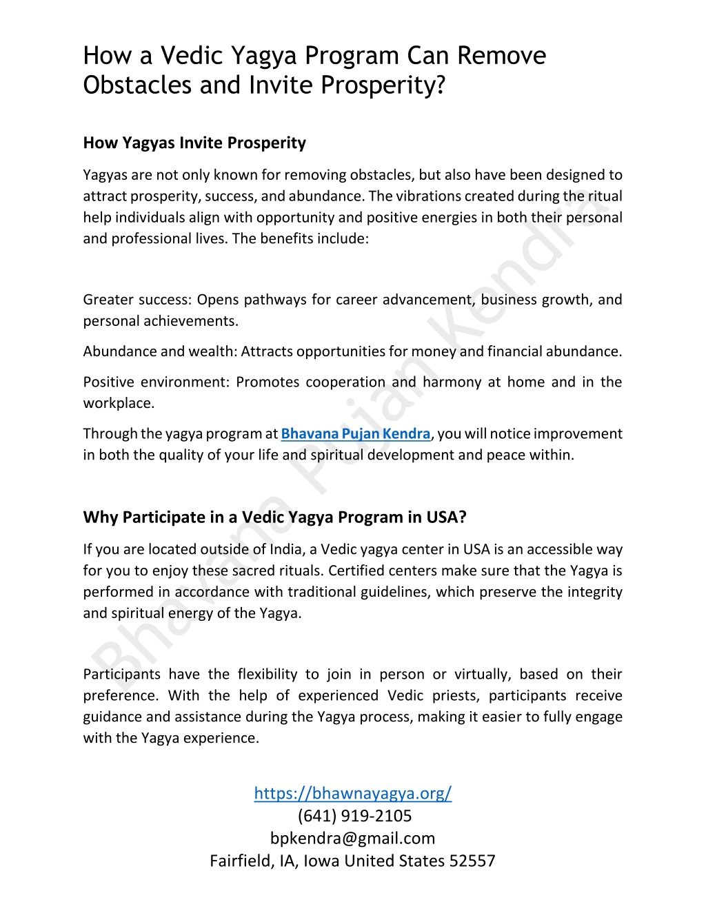 How a Vedic Yagya Program Can Remove Obstacles and Invite Prosperity? How Yagyas Invite Prosperity Yagyas are not only known for removing obstacles, but also have been designed to attract prosperity, success, and abundance. The vibrations created during the ritual help individuals align with opportunity and positive energies in both their personal and professional lives. The benefits include: Greater success: Opens pathways for career advancement, business growth, and personal achievements. Abundance and wealth: Attracts opportunities for money and financial abundance. Positive environment: Promotes cooperation and harmony at home and in the workplace. Through the yagya program at Bhavana Pujan Kendra, you will notice improvement in both the quality of your life and spiritual development and peace within. Why Participate in a Vedic Yagya Program in USA? If you are located outside of India, a Vedic yagya center in USA is an accessible way for you to enjoy these sacred rituals. Certified centers make sure that the Yagya is performed in accordance with traditional guidelines, which preserve the integrity and spiritual energy of the Yagya. Participants have the flexibility to join in person or virtually, based on their preference. With the help of experienced Vedic priests, participants receive guidance and assistance during the Yagya process, making it easier to fully engage with the Yagya experience. https://bhawnayagya.org/ (641) 919-2105 bpkendra@gmail.com Fairfield, IA, Iowa United States 52557