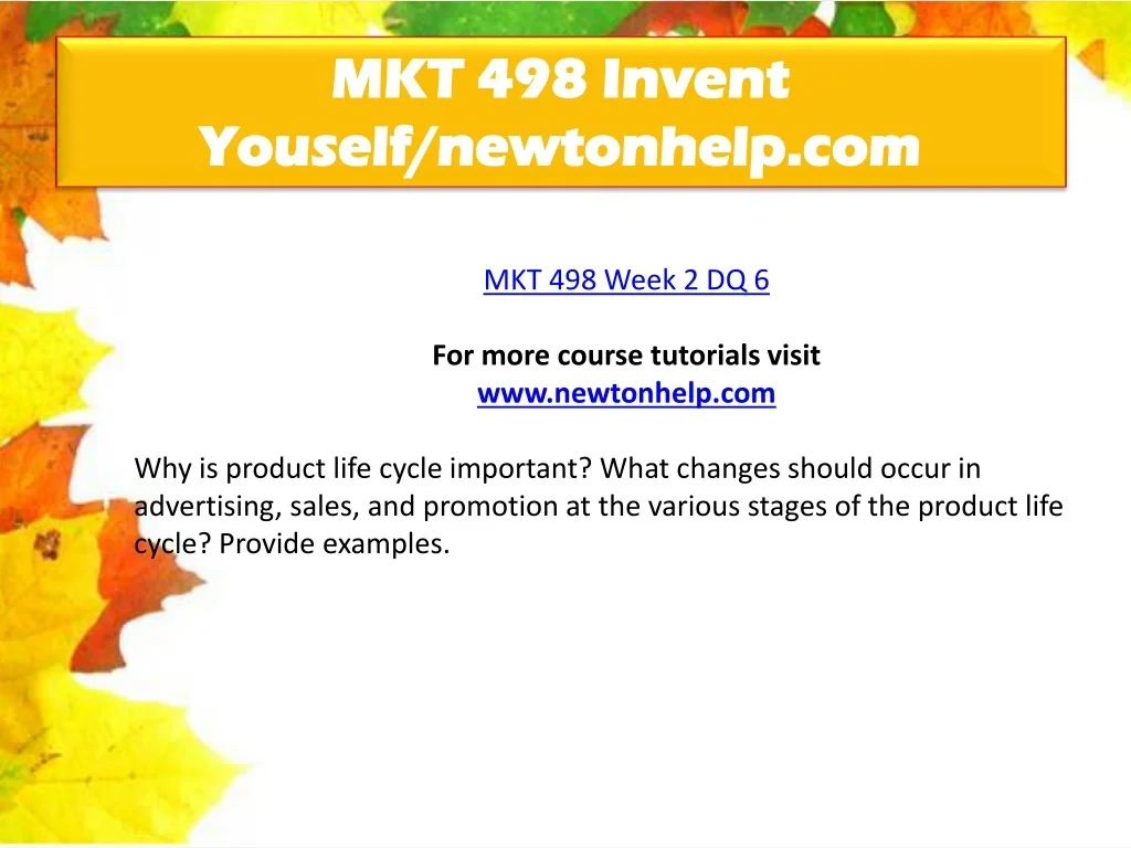 MKT 498 Invent Youself/newtonhelp.com MKT 498 Week 2 DQ 6 For more course tutorials visit www.newtonhelp.com Why is product life cycle important? What changes should occur in advertising, sales, and promotion at the various stages of the product life cycle? Provide examples.