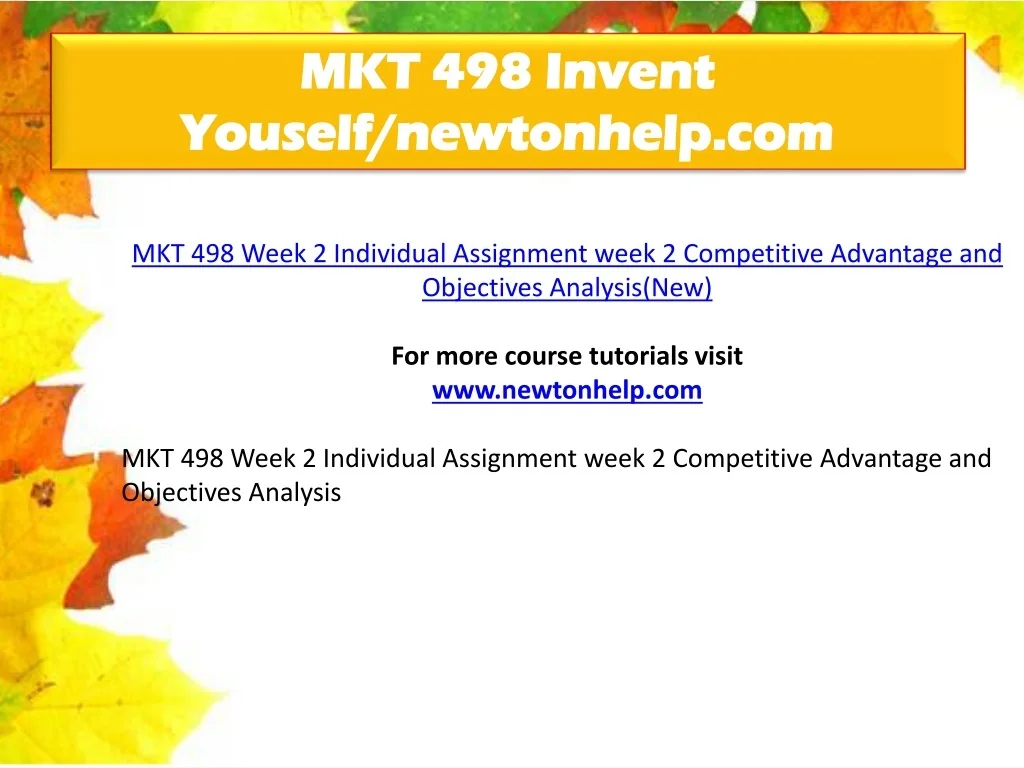 MKT 498 Invent Youself/newtonhelp.com MKT 498 Week 2 Individual Assignment week 2 Competitive Advantage and Objectives Analysis(New) For more course tutorials visit www.newtonhelp.com MKT 498 Week 2 Individual Assignment week 2 Competitive Advantage and Objectives Analysis
