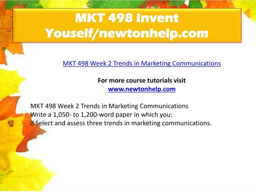 MKT 498 Invent Youself/newtonhelp.com MKT 498 Week 2 Trends in Marketing Communications For more course tutorials visit www.newtonhelp.com MKT 498 Week 2 Trends in Marketing Communications Write a 1,050- to 1,200-word paper in which you: Select and assess three trends in marketing communications.