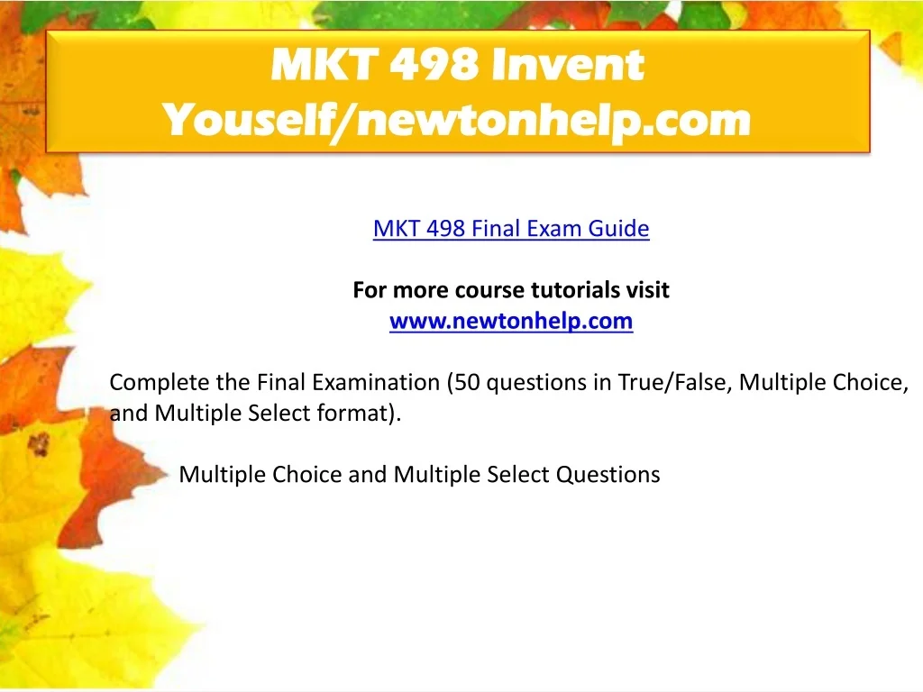 MKT 498 Invent Youself/newtonhelp.com MKT 498 Final Exam Guide For more course tutorials visit www.newtonhelp.com Complete the Final Examination (50 questions in True/False, Multiple Choice, and Multiple Select format). Multiple Choice and Multiple Select Questions