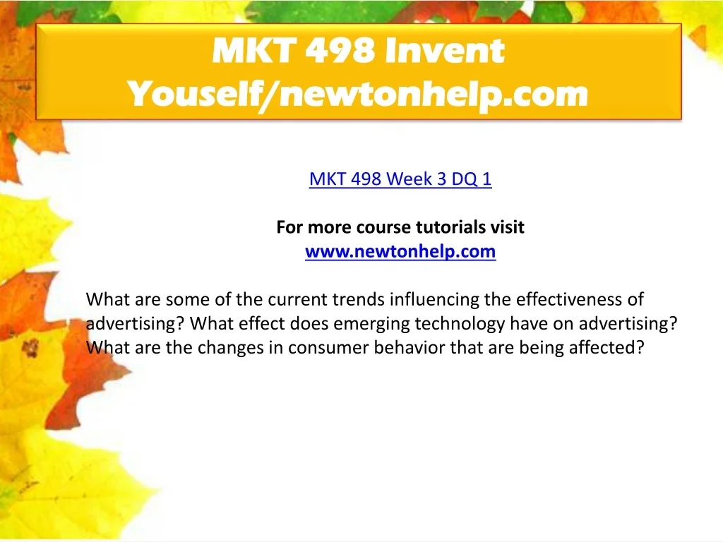 MKT 498 Invent Youself/newtonhelp.com MKT 498 Week 3 DQ 1 For more course tutorials visit www.newtonhelp.com What are some of the current trends influencing the effectiveness of advertising? What effect does emerging technology have on advertising? What are the changes in consumer behavior that are being affected?