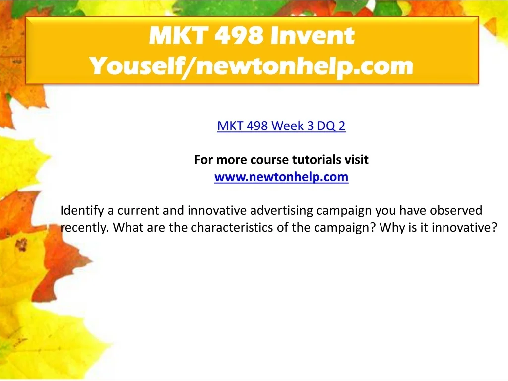 MKT 498 Invent Youself/newtonhelp.com MKT 498 Week 3 DQ 2 For more course tutorials visit www.newtonhelp.com Identify a current and innovative advertising campaign you have observed recently. What are the characteristics of the campaign? Why is it innovative?