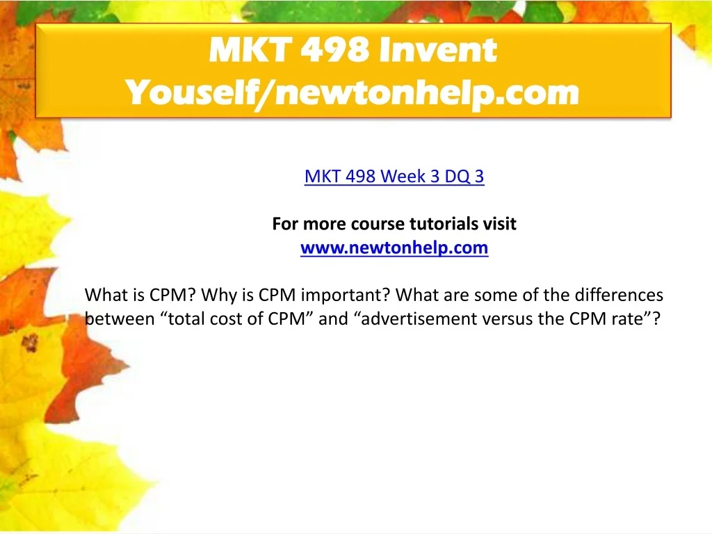 MKT 498 Invent Youself/newtonhelp.com MKT 498 Week 3 DQ 3 For more course tutorials visit www.newtonhelp.com What is CPM? Why is CPM important? What are some of the differences between “total cost of CPM” and “advertisement versus the CPM rate”?