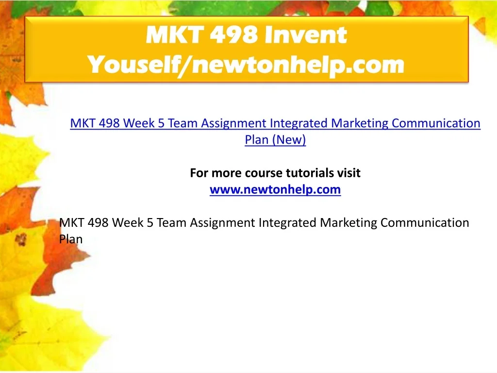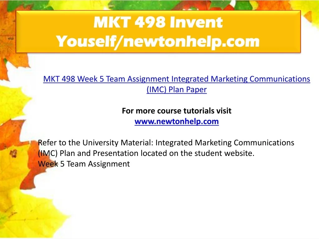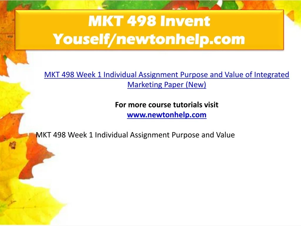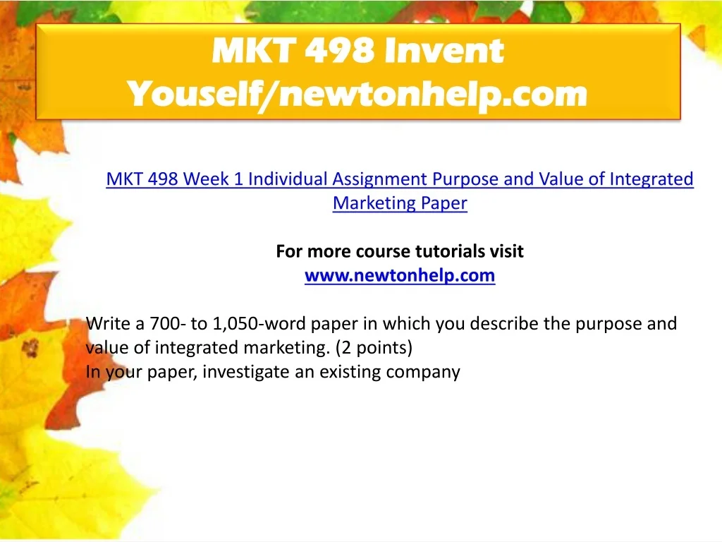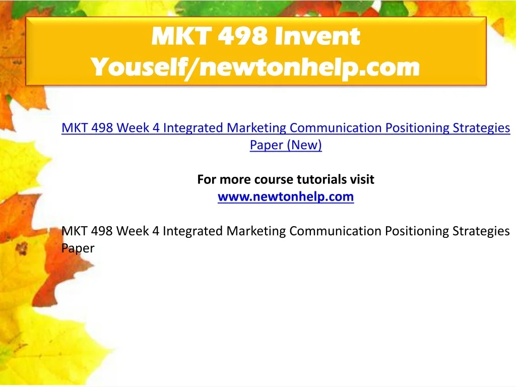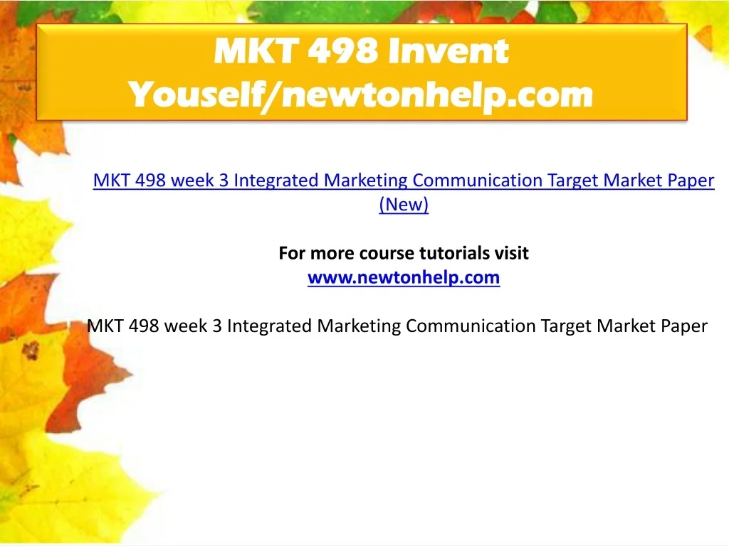 MKT 498 Invent Youself/newtonhelp.com Mkt 498 Entire Course (New Syllabus) For more course tutorials visit www.newtonhelp.com MKT 498 Week 1 Purpose and Value of Integrated Marketing Communications MKT 498 Week 2 Product and Market Identification MKT 498 Week 2 Trends in Marketing Communications