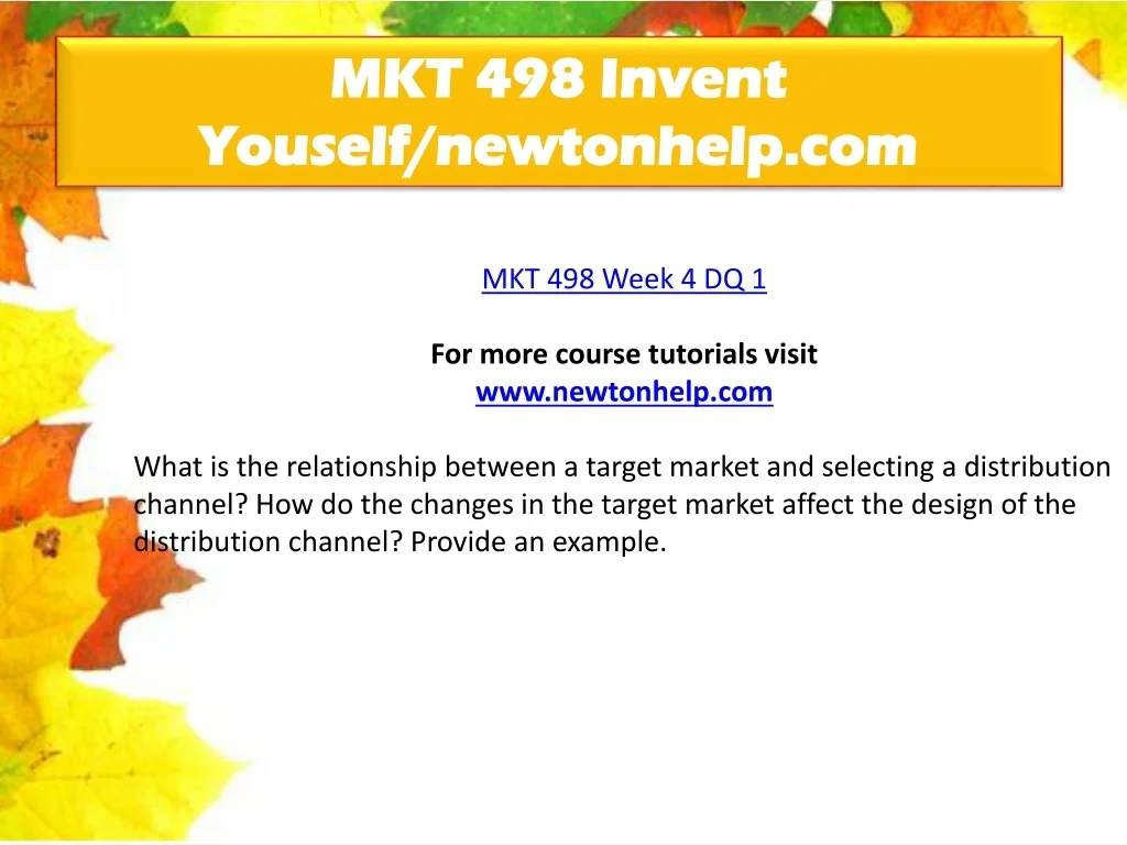 MKT 498 Invent Youself/newtonhelp.com MKT 498 Week 4 DQ 1 For more course tutorials visit www.newtonhelp.com What is the relationship between a target market and selecting a distribution channel? How do the changes in the target market affect the design of the distribution channel? Provide an example.