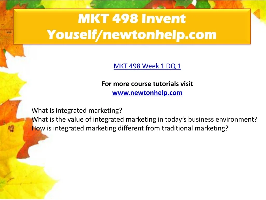 MKT 498 Invent Youself/newtonhelp.com MKT 498 Week 1 DQ 1 For more course tutorials visit www.newtonhelp.com What is integrated marketing? What is the value of integrated marketing in today’s business environment? How is integrated marketing different from traditional marketing?