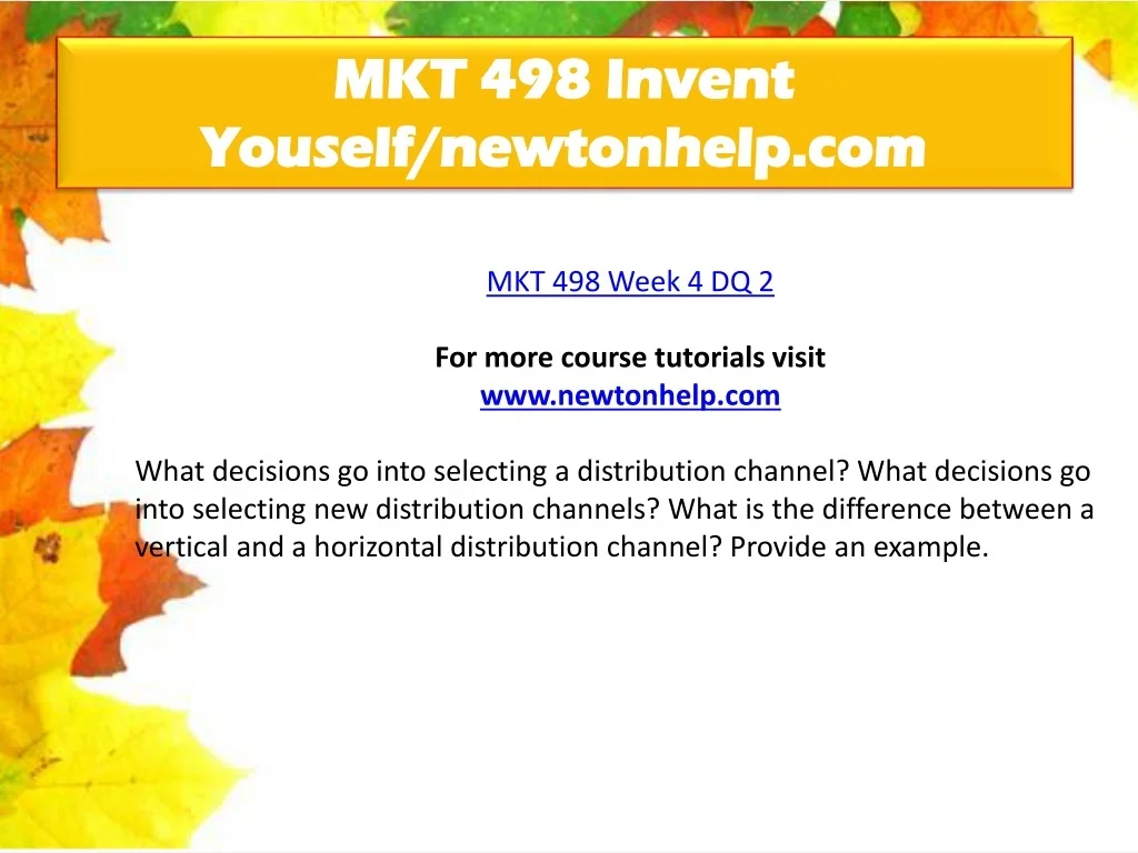 MKT 498 Invent Youself/newtonhelp.com MKT 498 Week 4 DQ 2 For more course tutorials visit www.newtonhelp.com What decisions go into selecting a distribution channel? What decisions go into selecting new distribution channels? What is the difference between a vertical and a horizontal distribution channel? Provide an example.