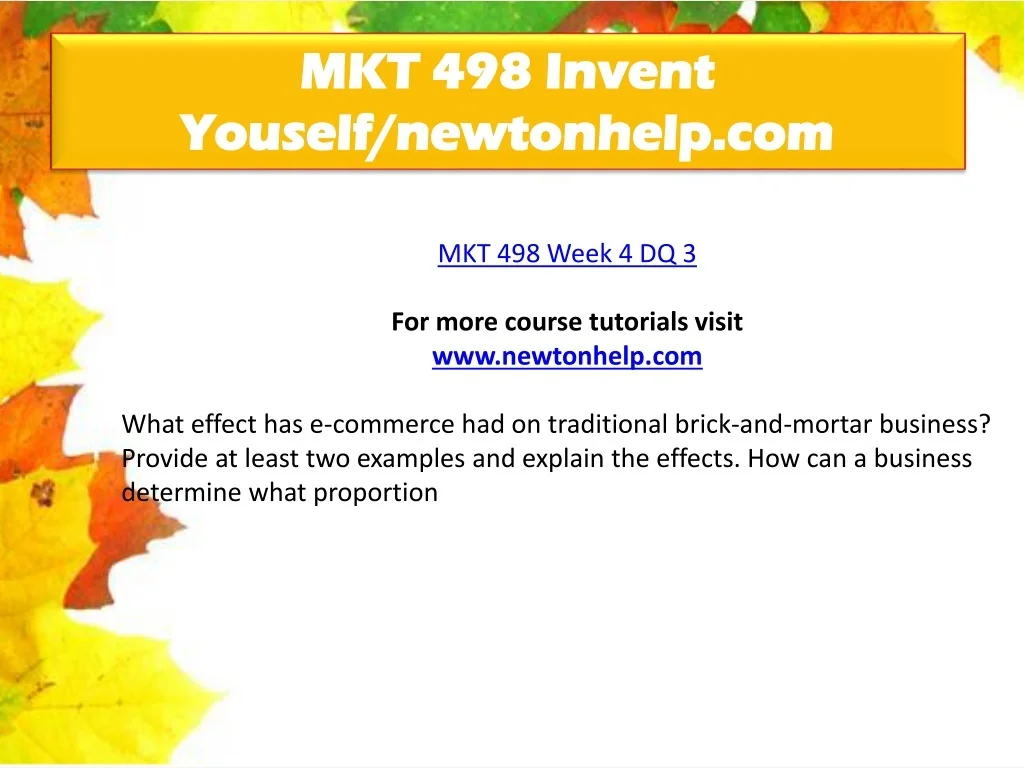 MKT 498 Invent Youself/newtonhelp.com MKT 498 Week 4 DQ 3 For more course tutorials visit www.newtonhelp.com What effect has e-commerce had on traditional brick-and-mortar business? Provide at least two examples and explain the effects. How can a business determine what proportion