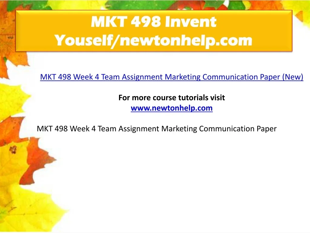 MKT 498 Invent Youself/newtonhelp.com MKT 498 Week 4 Team Assignment Marketing Communication Paper (New) For more course tutorials visit www.newtonhelp.com MKT 498 Week 4 Team Assignment Marketing Communication Paper