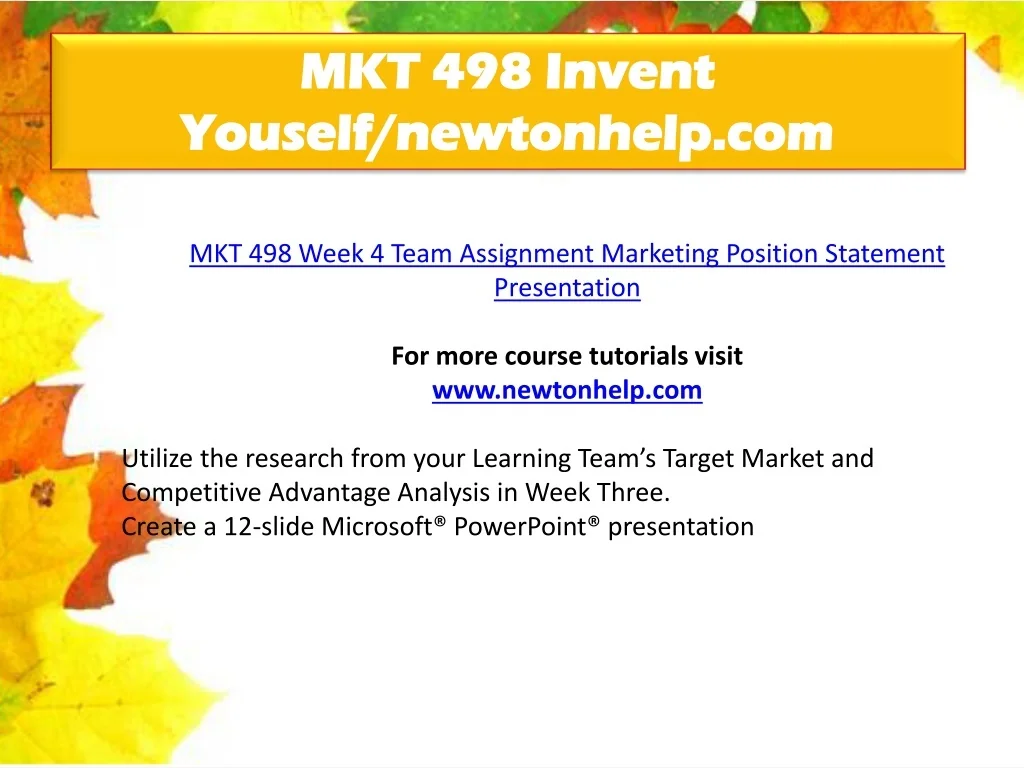 MKT 498 Invent Youself/newtonhelp.com MKT 498 Week 4 Team Assignment Marketing Position Statement Presentation For more course tutorials visit www.newtonhelp.com Utilize the research from your Learning Team’s Target Market and Competitive Advantage Analysis in Week Three. Create a 12-slide Microsoft® PowerPoint® presentation