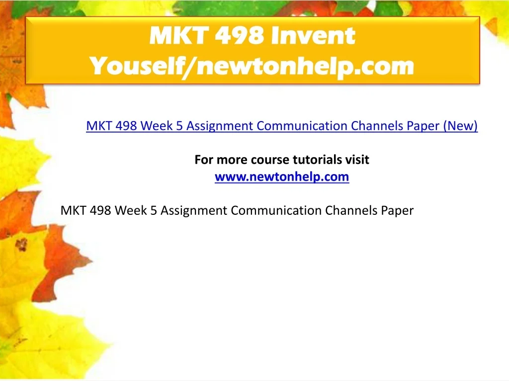 MKT 498 Invent Youself/newtonhelp.com MKT 498 Week 5 Assignment Communication Channels Paper (New) For more course tutorials visit www.newtonhelp.com MKT 498 Week 5 Assignment Communication Channels Paper