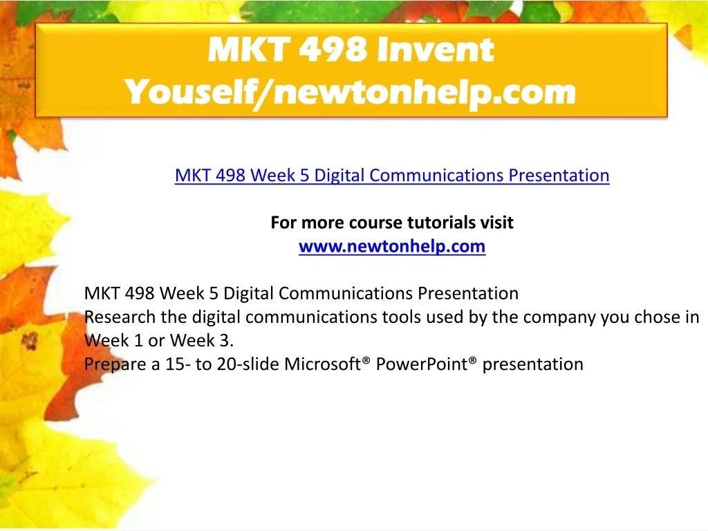 MKT 498 Invent Youself/newtonhelp.com MKT 498 Week 5 Digital Communications Presentation For more course tutorials visit www.newtonhelp.com MKT 498 Week 5 Digital Communications Presentation Research the digital communications tools used by the company you chose in Week 1 or Week 3. Prepare a 15- to 20-slide Microsoft® PowerPoint® presentation