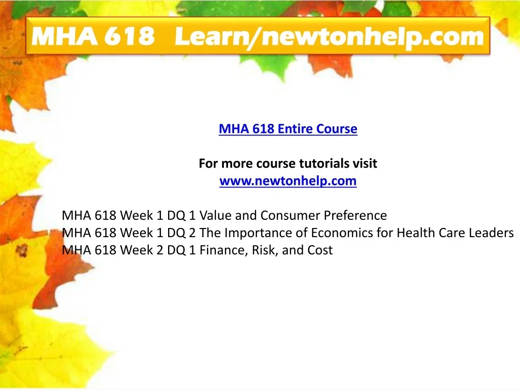 MHA 618 Learn/newtonhelp.com MHA 618 Entire Course For more course tutorials visit www.newtonhelp.com MHA 618 Week 1 DQ 1 Value and Consumer Preference MHA 618 Week 1 DQ 2 The Importance of Economics for Health Care Leaders MHA 618 Week 2 DQ 1 Finance, Risk, and Cost