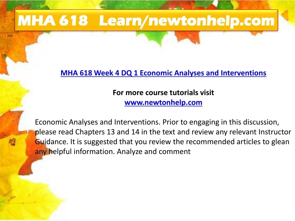 MHA 618 Learn/newtonhelp.com MHA 618 Week 4 DQ 1 Economic Analyses and Interventions For more course tutorials visit www.newtonhelp.com Economic Analyses and Interventions. Prior to engaging in this discussion, please read Chapters 13 and 14 in the text and review any relevant Instructor Guidance. It is suggested that you review the recommended articles to glean any helpful information. Analyze and comment
