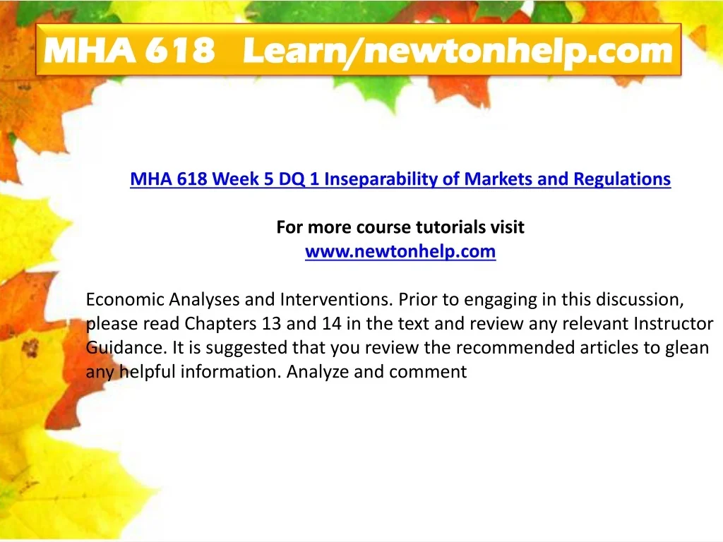 MHA 618 Learn/newtonhelp.com MHA 618 Week 5 DQ 1 Inseparability of Markets and Regulations For more course tutorials visit www.newtonhelp.com Economic Analyses and Interventions. Prior to engaging in this discussion, please read Chapters 13 and 14 in the text and review any relevant Instructor Guidance. It is suggested that you review the recommended articles to glean any helpful information. Analyze and comment