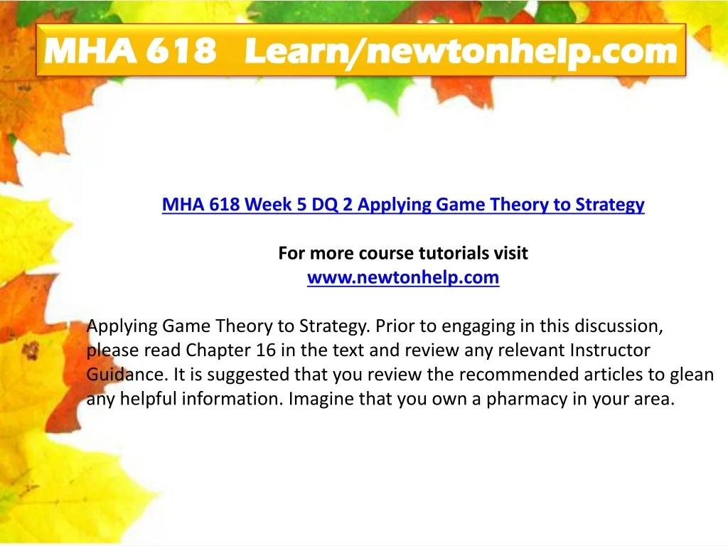 MHA 618 Learn/newtonhelp.com MHA 618 Week 5 DQ 2 Applying Game Theory to Strategy For more course tutorials visit www.newtonhelp.com Applying Game Theory to Strategy. Prior to engaging in this discussion, please read Chapter 16 in the text and review any relevant Instructor Guidance. It is suggested that you review the recommended articles to glean any helpful information. Imagine that you own a pharmacy in your area.