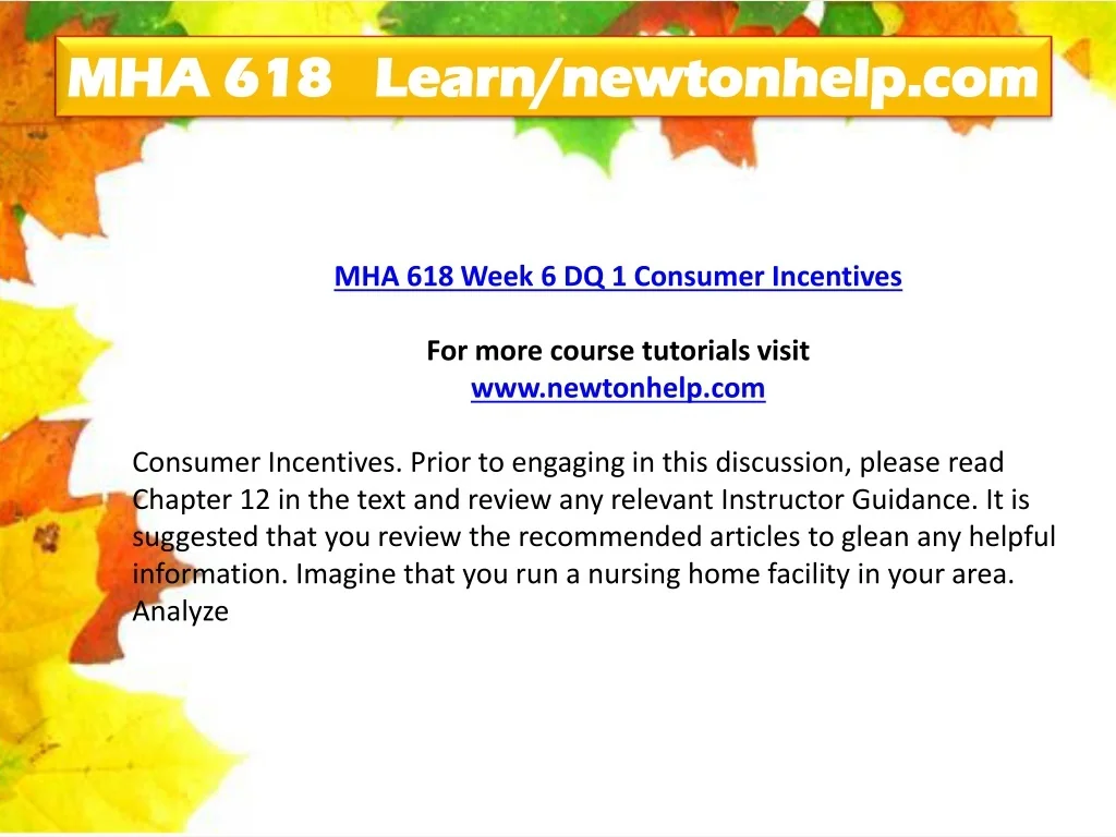 MHA 618 Learn/newtonhelp.com MHA 618 Week 6 DQ 1 Consumer Incentives For more course tutorials visit www.newtonhelp.com Consumer Incentives. Prior to engaging in this discussion, please read Chapter 12 in the text and review any relevant Instructor Guidance. It is suggested that you review the recommended articles to glean any helpful information. Imagine that you run a nursing home facility in your area. Analyze