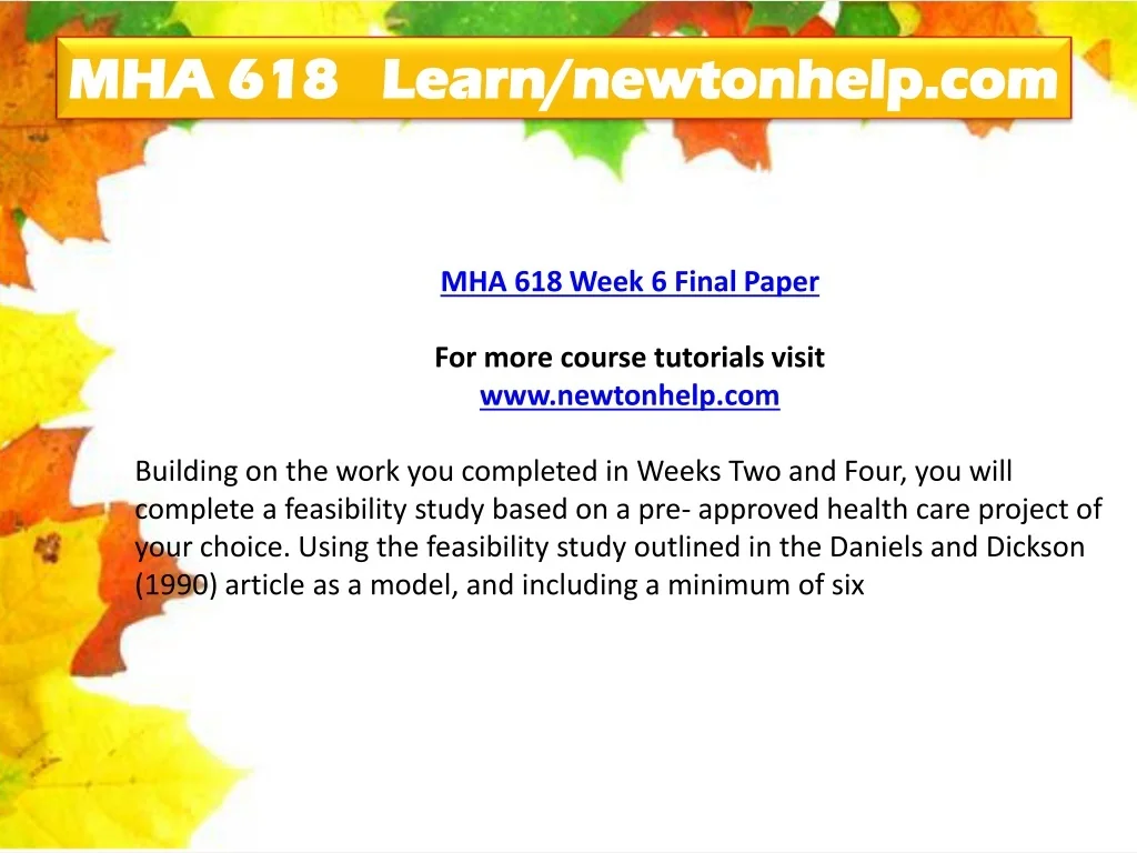MHA 618 Learn/newtonhelp.com MHA 618 Week 6 Final Paper For more course tutorials visit www.newtonhelp.com Building on the work you completed in Weeks Two and Four, you will complete a feasibility study based on a pre- approved health care project of your choice. Using the feasibility study outlined in the Daniels and Dickson (1990) article as a model, and including a minimum of six