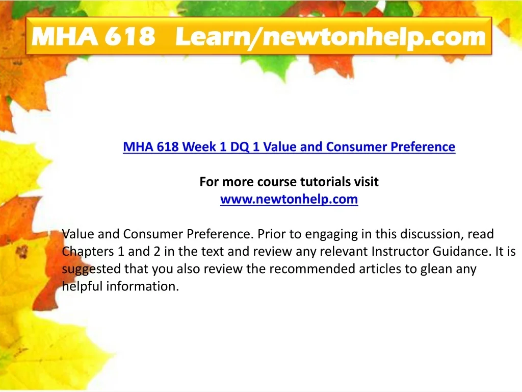 MHA 618 Learn/newtonhelp.com MHA 618 Week 1 DQ 1 Value and Consumer Preference For more course tutorials visit www.newtonhelp.com Value and Consumer Preference. Prior to engaging in this discussion, read Chapters 1 and 2 in the text and review any relevant Instructor Guidance. It is suggested that you also review the recommended articles to glean any helpful information.