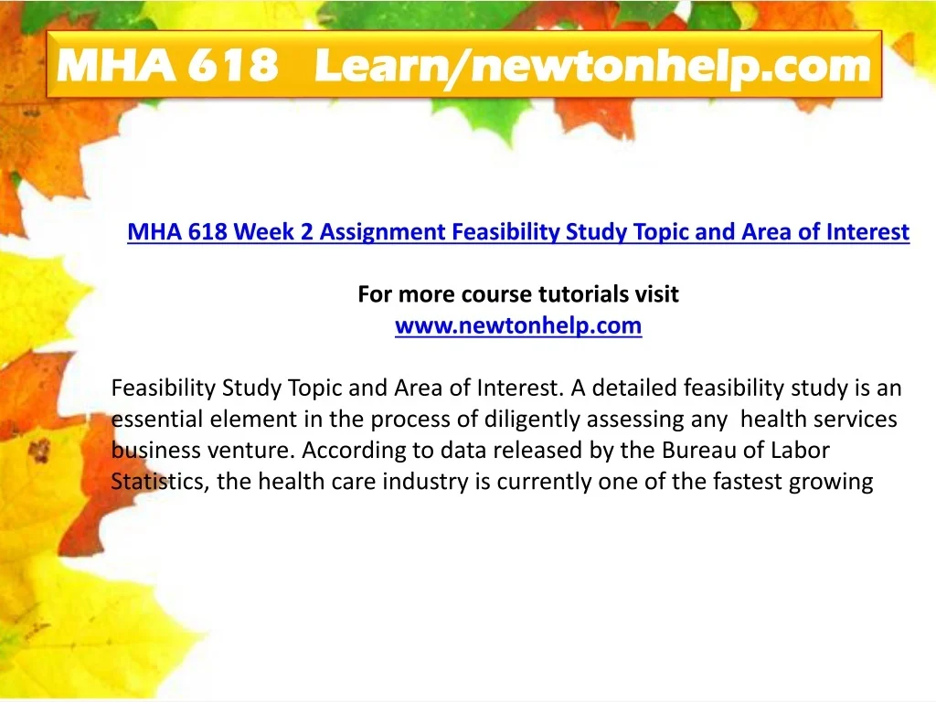 MHA 618 Learn/newtonhelp.com MHA 618 Week 2 Assignment Feasibility Study Topic and Area of Interest For more course tutorials visit www.newtonhelp.com Feasibility Study Topic and Area of Interest. A detailed feasibility study is an essential element in the process of diligently assessing any health services business venture. According to data released by the Bureau of Labor Statistics, the health care industry is currently one of the fastest growing