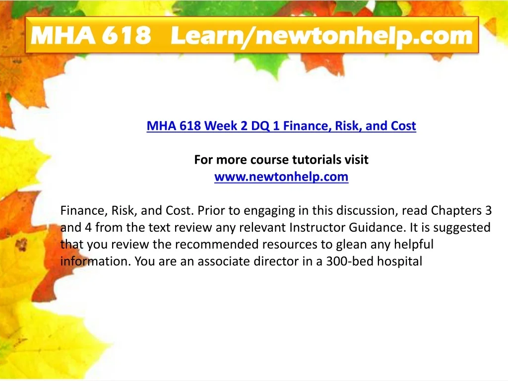 MHA 618 Learn/newtonhelp.com MHA 618 Week 2 DQ 1 Finance, Risk, and Cost For more course tutorials visit www.newtonhelp.com Finance, Risk, and Cost. Prior to engaging in this discussion, read Chapters 3 and 4 from the text review any relevant Instructor Guidance. It is suggested that you review the recommended resources to glean any helpful information. You are an associate director in a 300-bed hospital